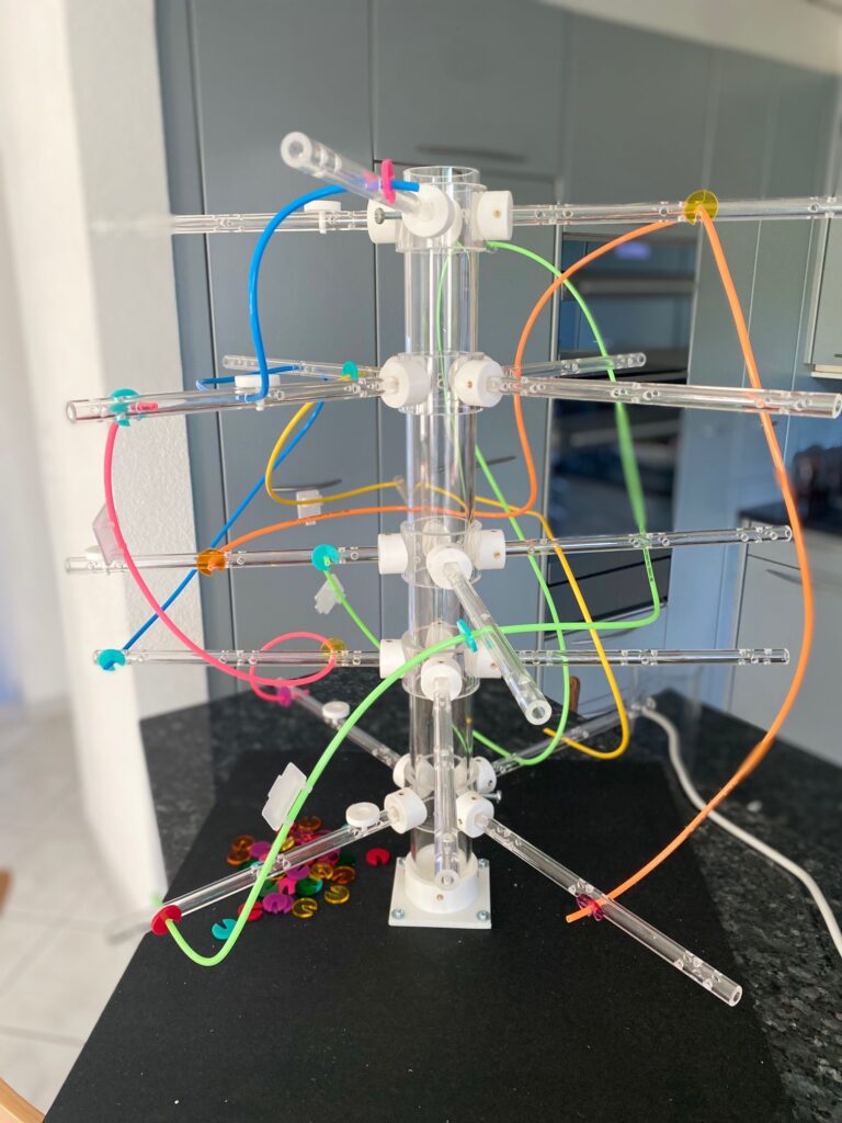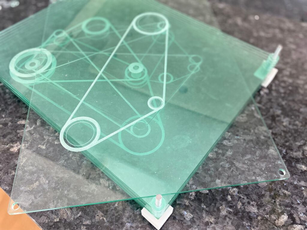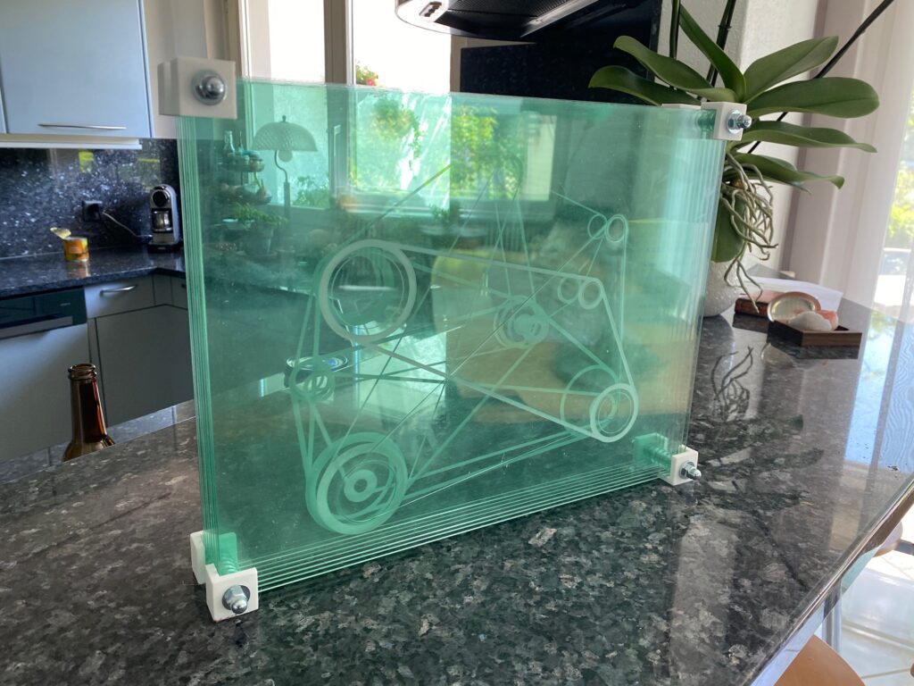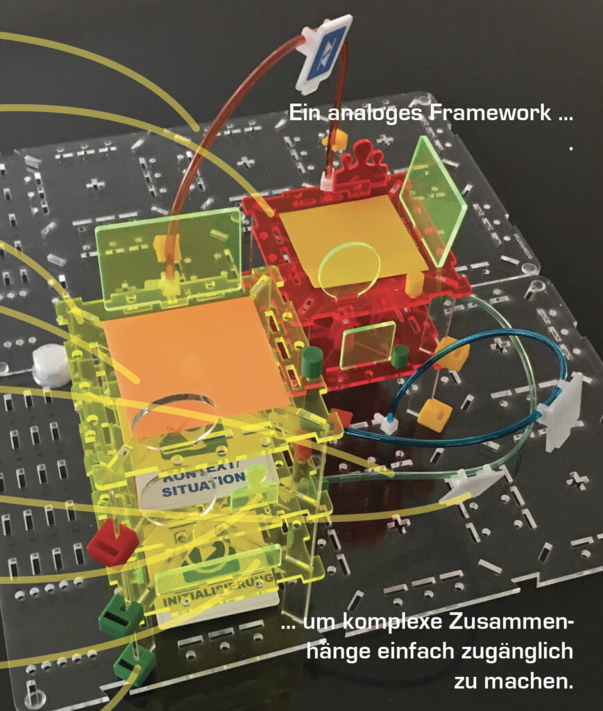 Das Objekt Layermix lehnt an György Gaspars Glasobjekten an. Die Layer können entfernt, neu geordnet, ergänzt oder „falsch“ eingesetzt werden. Mit dem Layermix wird schnell erkennbar, dass komplexe Konstrukte u.a. bei Veränderungen immer als Ganzes erkennbar bleiben. „Fehler“ sind sofort erkennbar und lokalisierbar – also wo bzw. auf welchem Layer der Fehler ist. Anpassungen an Struktur oder Themen sind einfacher zu realisieren und zu verstehen, als bei komplexen grafischen Lösungen.