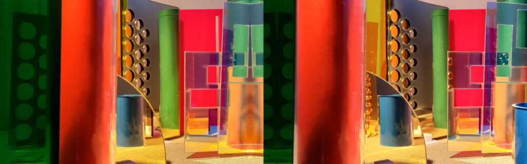 Um die räumliche Wirkung zu sehen, braucht man ein Prisma vor dem einen Auge, welches das Bild leicht horizontal versetzt. Etwas provokativ kann man sagen, dass erst die Relation -also die Verbindung mit dem Prisma – die Substanz wirkungsvoll macht.